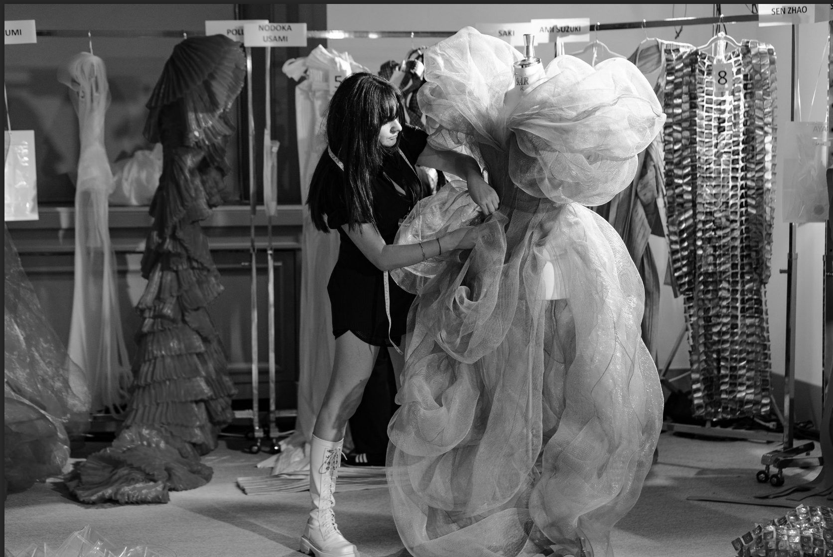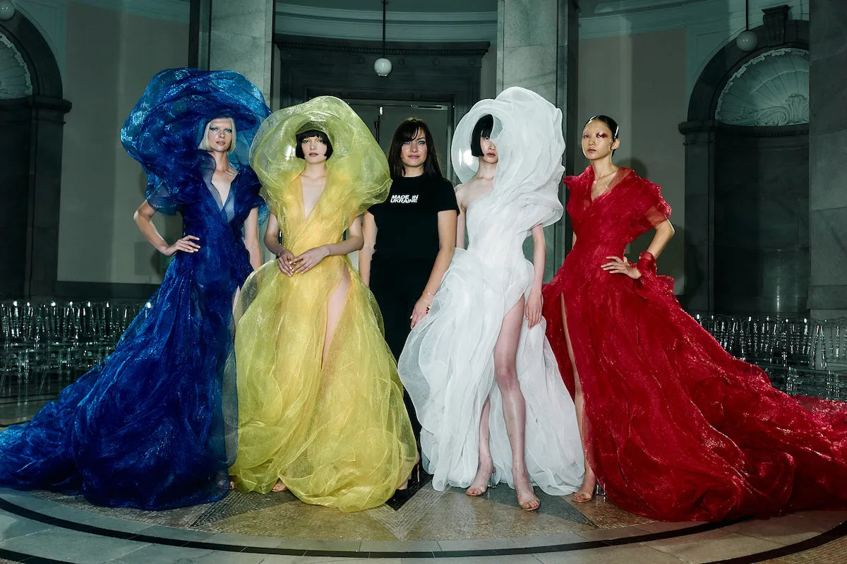 The show was held in the Hyokeikan of the Tokyo National Museum in Ueno, Tokyo. The designer showcased long dresses that share colors from the Japanese and Ukrainian flags, representing the bond between the two countries.